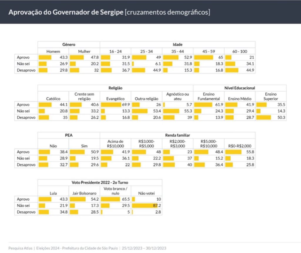 Por outro lado, o governador de Sergipe parece contar com a aprovação de dois grupos distintos: os evangélicos e os bolsonaristas. Essa aprovação, segundo o AtlasIntel, pode estar relacionada a políticas específicas ou posturas adotadas por Mitidieri que ressoam positivamente junto a essas comunidades.